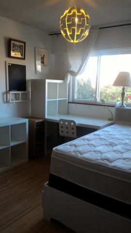 お部屋は、西向きのとても明るいベッドルームです。 ライトなしでも日中は十分なくらいですよ。 蛍光灯が天井に1つ、デスクに1つ、ベッドサイドに1つで明かりの心配は要らないです。