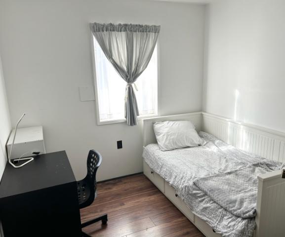 窓のある明るいお部屋で、引き出し付きのベッド、机の他、ハンガーラックと棚のご用意もあります